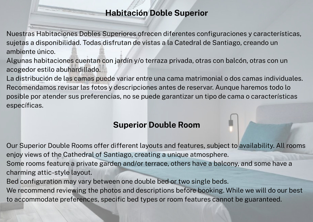 Habitación en un hotel clásico con encanto pero con un toque moderno para un máximo de 2 personas en 1 cama grande o 2 camas individuales con magníficas vistas a la fachada del Obradoiro